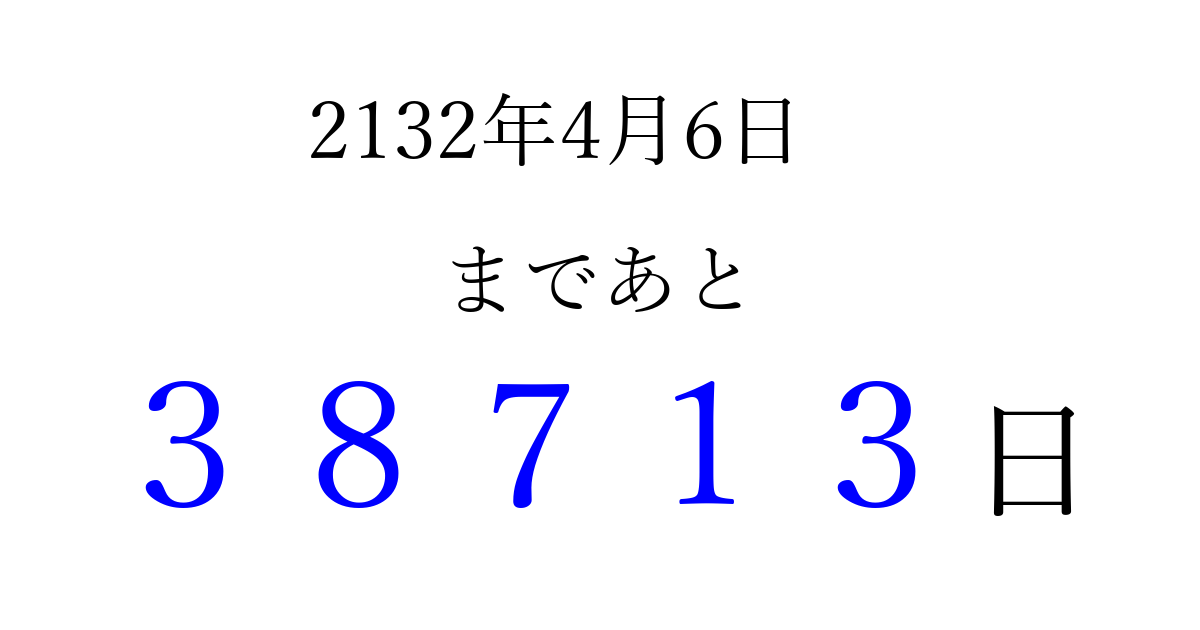 2132年4月6日(日)まで あと 99999 日です 追加すると、トップページからすぐ選べるようになります ※2026/04/09現在の結果です。 最新の状態に更新する ↓シェアして、タイムライン上にカウントダウンを表示しよう!↓ 📤 この結果を共有する Tweet シェア Threads Bluesky 別の日付でカウントダウン 2132年4月のカレンダー このページをブックマークに追加すると、いつでもカウントダウンを確認できます。 (PC: Ctrl+D / Mac: ⌘+D) hitome-notes.comでは以下のページも運営しています。 指定日と期間から日付を計算 | ガチャ確率計算・シミュレーション | プライバシー・ポリシー 運営者:Avocado