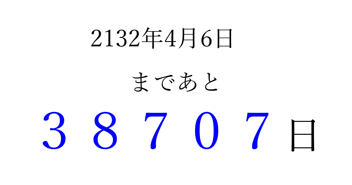2132年4月6日(日)まで あと 99999 日です 追加すると、トップページからすぐ選べるようになります ※2026/04/15現在の結果です。 最新の状態に更新する ↓シェアして、タイムライン上にカウントダウンを表示しよう!↓ 📤 この結果を共有する Tweet シェア Threads Bluesky 別の日付でカウントダウン 2132年4月のカレンダー このページをブックマークに追加すると、いつでもカウントダウンを確認できます。 (PC: Ctrl+D / Mac: ⌘+D) hitome-notes.comでは以下のページも運営しています。 指定日と期間から日付を計算 | ガチャ確率計算・シミュレーション | プライバシー・ポリシー 運営者:Avocado