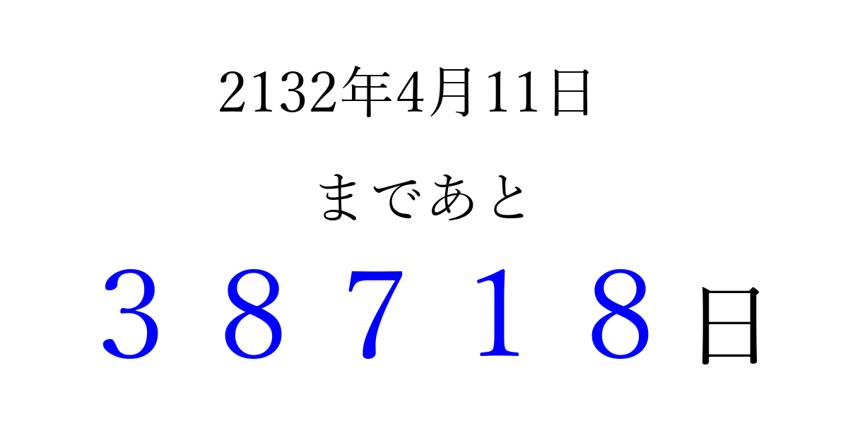 2132年4月11日(金)まで あと 99999 日です 追加すると、トップページからすぐ選べるようになります ※2026/04/09現在の結果です。 最新の状態に更新する ↓シェアして、タイムライン上にカウントダウンを表示しよう!↓ 📤 この結果を共有する Tweet シェア Threads Bluesky 別の日付でカウントダウン 2132年4月のカレンダー このページをブックマークに追加すると、いつでもカウントダウンを確認できます。 (PC: Ctrl+D / Mac: ⌘+D) hitome-notes.comでは以下のページも運営しています。 指定日と期間から日付を計算 | ガチャ確率計算・シミュレーション | プライバシー・ポリシー 運営者:Avocado