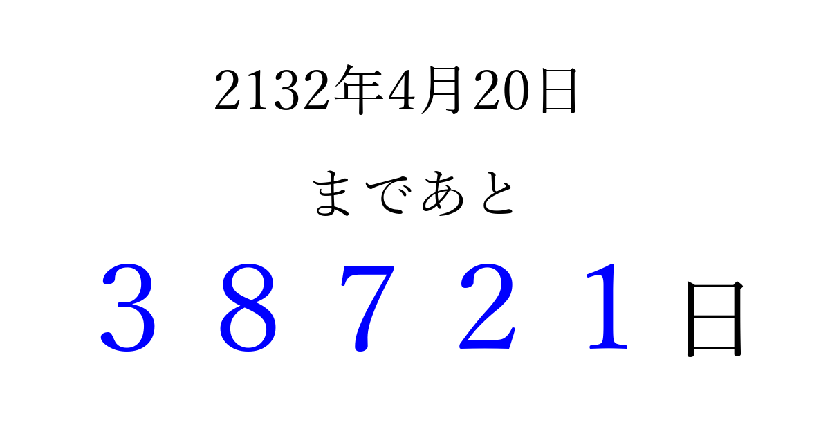 2132年4月20日(日)まで あと 99999 日です 追加すると、トップページからすぐ選べるようになります ※2026/04/15現在の結果です。 最新の状態に更新する ↓シェアして、タイムライン上にカウントダウンを表示しよう!↓ 📤 この結果を共有する Tweet シェア Threads Bluesky 別の日付でカウントダウン 2132年4月のカレンダー このページをブックマークに追加すると、いつでもカウントダウンを確認できます。 (PC: Ctrl+D / Mac: ⌘+D) hitome-notes.comでは以下のページも運営しています。 指定日と期間から日付を計算 | ガチャ確率計算・シミュレーション | プライバシー・ポリシー 運営者:Avocado