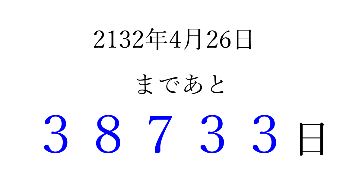 2132年4月26日(土)まで あと 99999 日です 追加すると、トップページからすぐ選べるようになります ※2026/04/09現在の結果です。 最新の状態に更新する ↓シェアして、タイムライン上にカウントダウンを表示しよう!↓ 📤 この結果を共有する Tweet シェア Threads Bluesky 別の日付でカウントダウン 2132年4月のカレンダー このページをブックマークに追加すると、いつでもカウントダウンを確認できます。 (PC: Ctrl+D / Mac: ⌘+D) hitome-notes.comでは以下のページも運営しています。 指定日と期間から日付を計算 | ガチャ確率計算・シミュレーション | プライバシー・ポリシー 運営者:Avocado