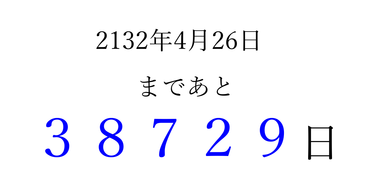 2132年4月26日(土)まで あと 99999 日です 追加すると、トップページからすぐ選べるようになります ※2026/04/13現在の結果です。 最新の状態に更新する ↓シェアして、タイムライン上にカウントダウンを表示しよう!↓ 📤 この結果を共有する Tweet シェア Threads Bluesky 別の日付でカウントダウン 2132年4月のカレンダー このページをブックマークに追加すると、いつでもカウントダウンを確認できます。 (PC: Ctrl+D / Mac: ⌘+D) hitome-notes.comでは以下のページも運営しています。 指定日と期間から日付を計算 | ガチャ確率計算・シミュレーション | プライバシー・ポリシー 運営者:Avocado