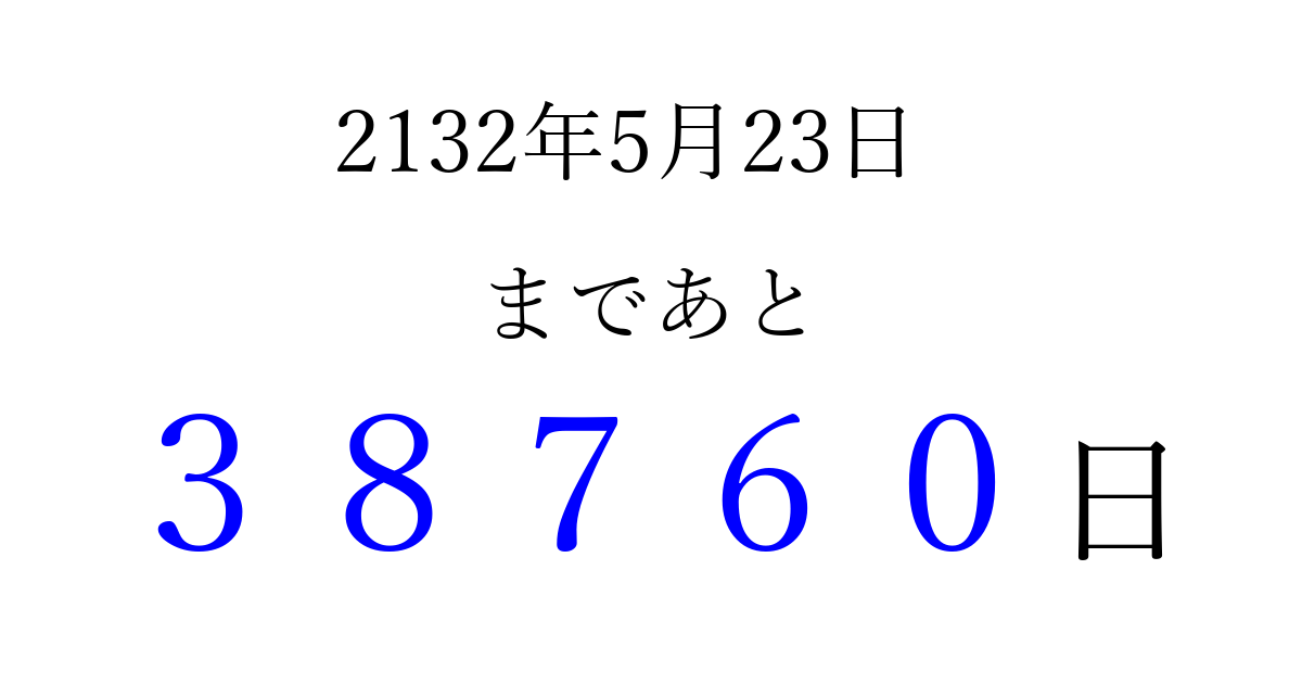 2132年5月23日(金)まで あと 99999 日です 追加すると、トップページからすぐ選べるようになります ※2026/04/09現在の結果です。 最新の状態に更新する ↓シェアして、タイムライン上にカウントダウンを表示しよう!↓ 📤 この結果を共有する Tweet シェア Threads Bluesky 別の日付でカウントダウン 2132年5月のカレンダー このページをブックマークに追加すると、いつでもカウントダウンを確認できます。 (PC: Ctrl+D / Mac: ⌘+D) hitome-notes.comでは以下のページも運営しています。 指定日と期間から日付を計算 | ガチャ確率計算・シミュレーション | プライバシー・ポリシー 運営者:Avocado