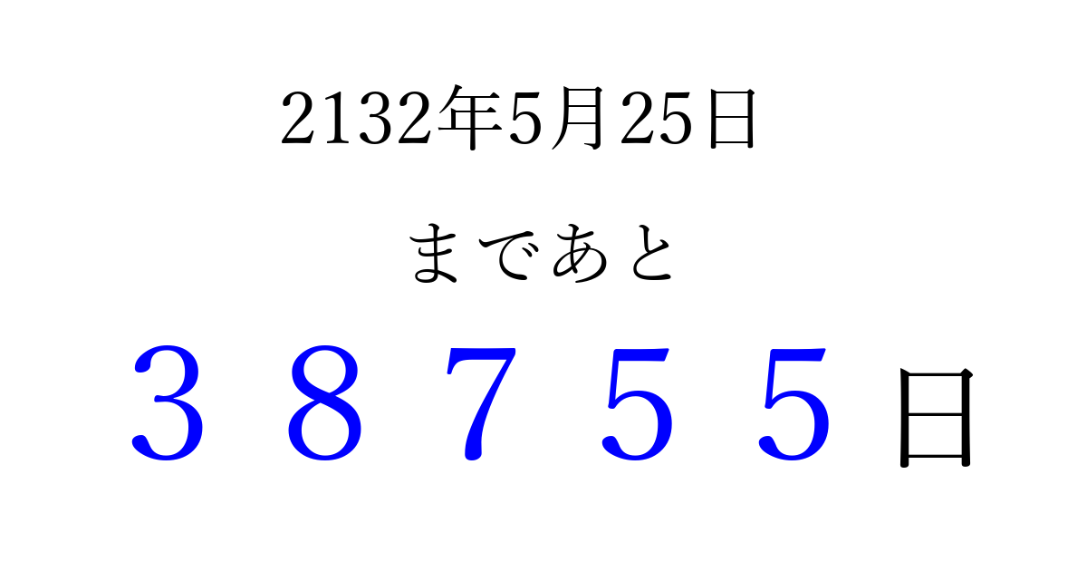 2132年5月25日(日)まで あと 99999 日です 追加すると、トップページからすぐ選べるようになります ※2026/04/16現在の結果です。 最新の状態に更新する ↓シェアして、タイムライン上にカウントダウンを表示しよう!↓ 📤 この結果を共有する Tweet シェア Threads Bluesky 別の日付でカウントダウン 2132年5月のカレンダー このページをブックマークに追加すると、いつでもカウントダウンを確認できます。 (PC: Ctrl+D / Mac: ⌘+D) hitome-notes.comでは以下のページも運営しています。 指定日と期間から日付を計算 | ガチャ確率計算・シミュレーション | プライバシー・ポリシー 運営者:Avocado