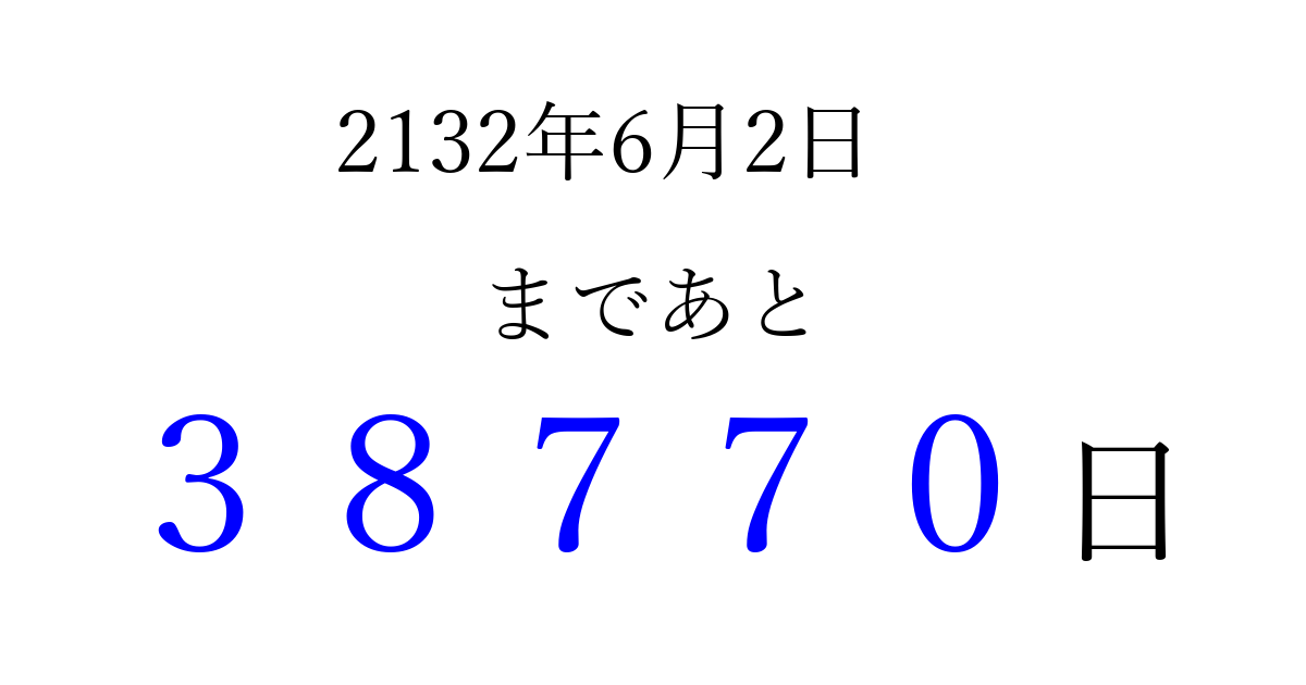 2132年6月2日(月)まで あと 99999 日です 追加すると、トップページからすぐ選べるようになります ※2026/04/09現在の結果です。 最新の状態に更新する ↓シェアして、タイムライン上にカウントダウンを表示しよう!↓ 📤 この結果を共有する Tweet シェア Threads Bluesky 別の日付でカウントダウン 2132年6月のカレンダー このページをブックマークに追加すると、いつでもカウントダウンを確認できます。 (PC: Ctrl+D / Mac: ⌘+D) hitome-notes.comでは以下のページも運営しています。 指定日と期間から日付を計算 | ガチャ確率計算・シミュレーション | プライバシー・ポリシー 運営者:Avocado