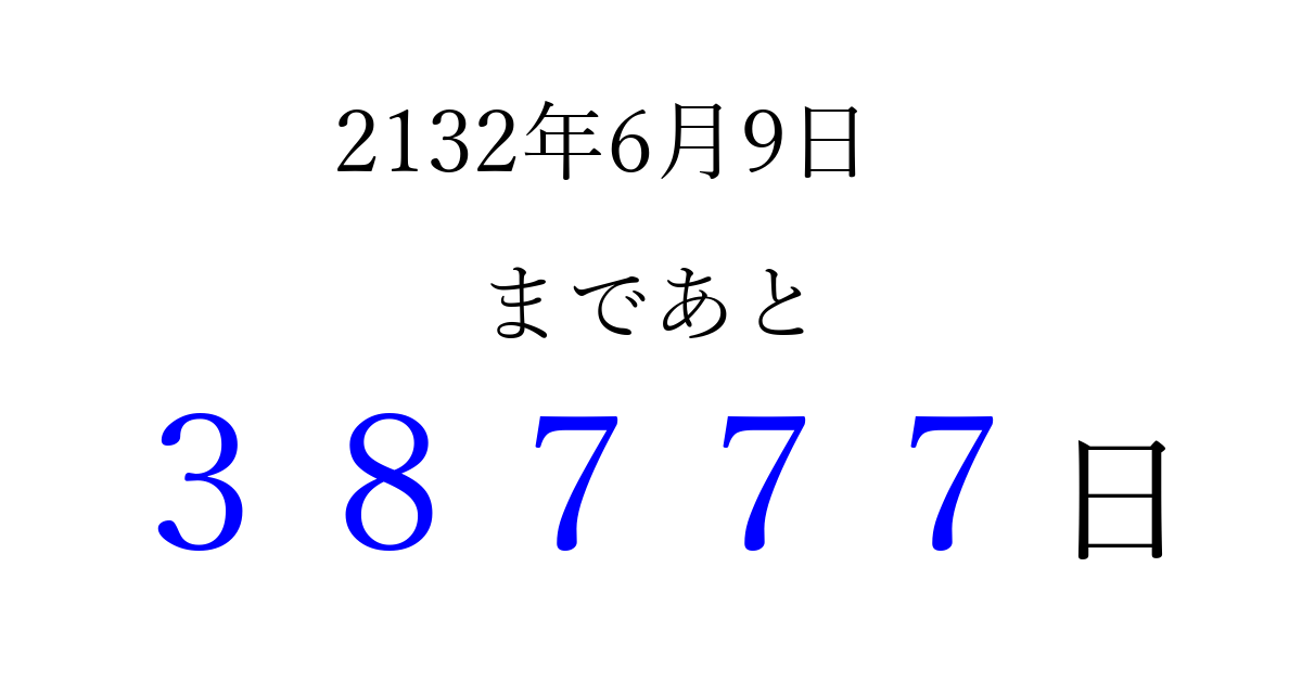 2132年6月9日(月)まで あと 99999 日です 追加すると、トップページからすぐ選べるようになります ※2026/04/09現在の結果です。 最新の状態に更新する ↓シェアして、タイムライン上にカウントダウンを表示しよう!↓ 📤 この結果を共有する Tweet シェア Threads Bluesky 別の日付でカウントダウン 2132年6月のカレンダー このページをブックマークに追加すると、いつでもカウントダウンを確認できます。 (PC: Ctrl+D / Mac: ⌘+D) hitome-notes.comでは以下のページも運営しています。 指定日と期間から日付を計算 | ガチャ確率計算・シミュレーション | プライバシー・ポリシー 運営者:Avocado