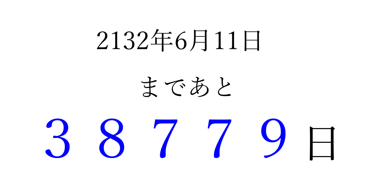 2132年6月11日(水)まで あと 99999 日です 追加すると、トップページからすぐ選べるようになります ※2026/04/09現在の結果です。 最新の状態に更新する ↓シェアして、タイムライン上にカウントダウンを表示しよう!↓ 📤 この結果を共有する Tweet シェア Threads Bluesky 別の日付でカウントダウン 2132年6月のカレンダー このページをブックマークに追加すると、いつでもカウントダウンを確認できます。 (PC: Ctrl+D / Mac: ⌘+D) hitome-notes.comでは以下のページも運営しています。 指定日と期間から日付を計算 | ガチャ確率計算・シミュレーション | プライバシー・ポリシー 運営者:Avocado