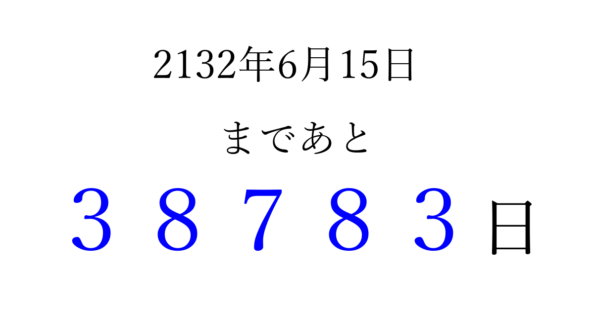 2132年6月15日(日)まで あと 99999 日です 追加すると、トップページからすぐ選べるようになります ※2026/04/09現在の結果です。 最新の状態に更新する ↓シェアして、タイムライン上にカウントダウンを表示しよう!↓ 📤 この結果を共有する Tweet シェア Threads Bluesky 別の日付でカウントダウン 2132年6月のカレンダー このページをブックマークに追加すると、いつでもカウントダウンを確認できます。 (PC: Ctrl+D / Mac: ⌘+D) hitome-notes.comでは以下のページも運営しています。 指定日と期間から日付を計算 | ガチャ確率計算・シミュレーション | プライバシー・ポリシー 運営者:Avocado