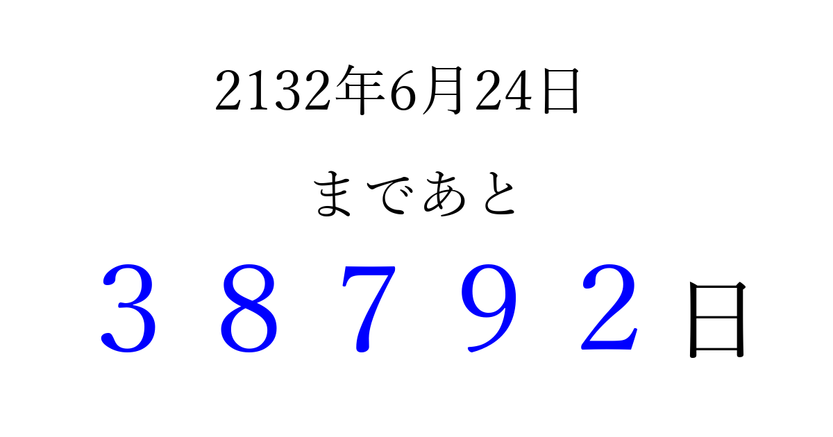 2132年6月24日(火)まで あと 99999 日です 追加すると、トップページからすぐ選べるようになります ※2026/04/09現在の結果です。 最新の状態に更新する ↓シェアして、タイムライン上にカウントダウンを表示しよう!↓ 📤 この結果を共有する Tweet シェア Threads Bluesky 別の日付でカウントダウン 2132年6月のカレンダー このページをブックマークに追加すると、いつでもカウントダウンを確認できます。 (PC: Ctrl+D / Mac: ⌘+D) hitome-notes.comでは以下のページも運営しています。 指定日と期間から日付を計算 | ガチャ確率計算・シミュレーション | プライバシー・ポリシー 運営者:Avocado