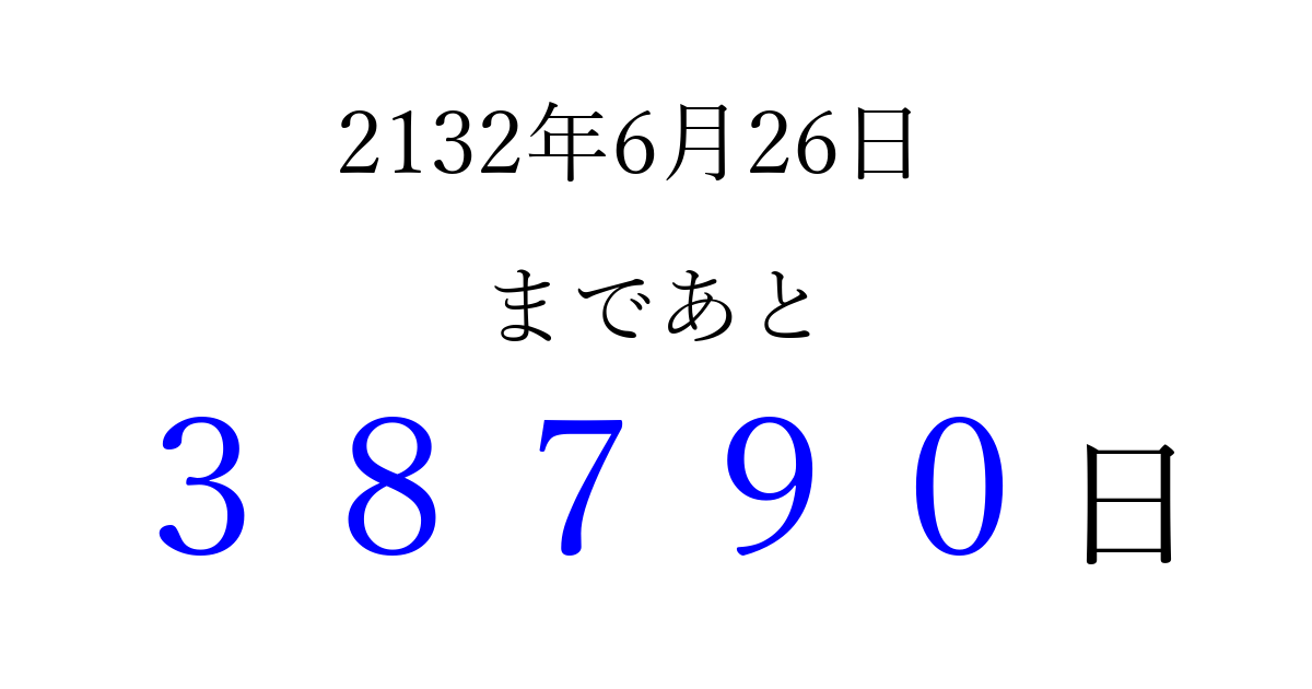 2132年6月26日(木)まで あと 99999 日です 追加すると、トップページからすぐ選べるようになります ※2026/04/13現在の結果です。 最新の状態に更新する ↓シェアして、タイムライン上にカウントダウンを表示しよう!↓ 📤 この結果を共有する Tweet シェア Threads Bluesky 別の日付でカウントダウン 2132年6月のカレンダー このページをブックマークに追加すると、いつでもカウントダウンを確認できます。 (PC: Ctrl+D / Mac: ⌘+D) hitome-notes.comでは以下のページも運営しています。 指定日と期間から日付を計算 | ガチャ確率計算・シミュレーション | プライバシー・ポリシー 運営者:Avocado
