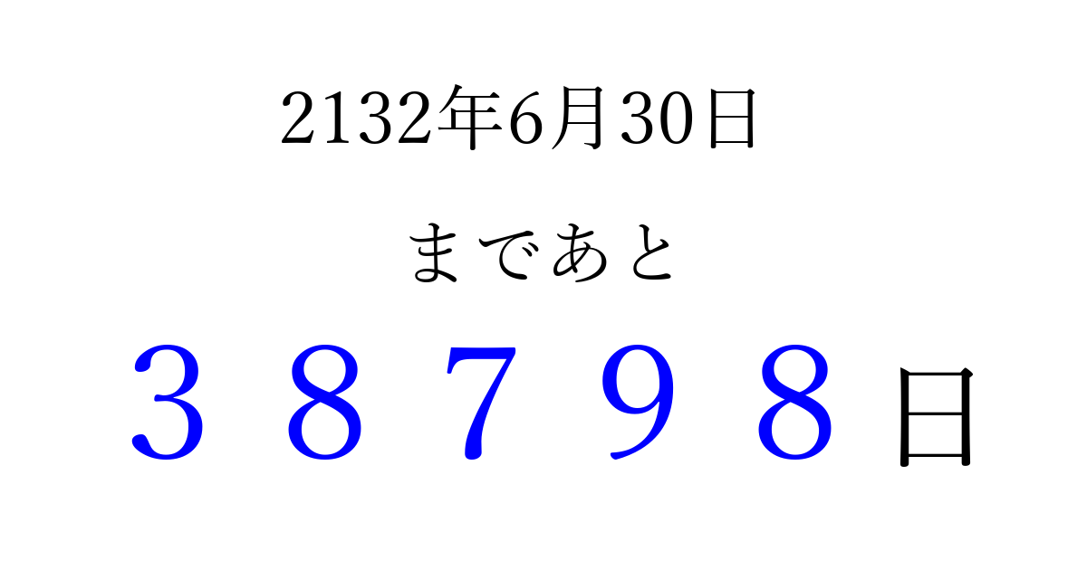 2132年6月30日(月)まで あと 99999 日です 追加すると、トップページからすぐ選べるようになります ※2026/04/09現在の結果です。 最新の状態に更新する ↓シェアして、タイムライン上にカウントダウンを表示しよう!↓ 📤 この結果を共有する Tweet シェア Threads Bluesky 別の日付でカウントダウン 2132年6月のカレンダー このページをブックマークに追加すると、いつでもカウントダウンを確認できます。 (PC: Ctrl+D / Mac: ⌘+D) hitome-notes.comでは以下のページも運営しています。 指定日と期間から日付を計算 | ガチャ確率計算・シミュレーション | プライバシー・ポリシー 運営者:Avocado
