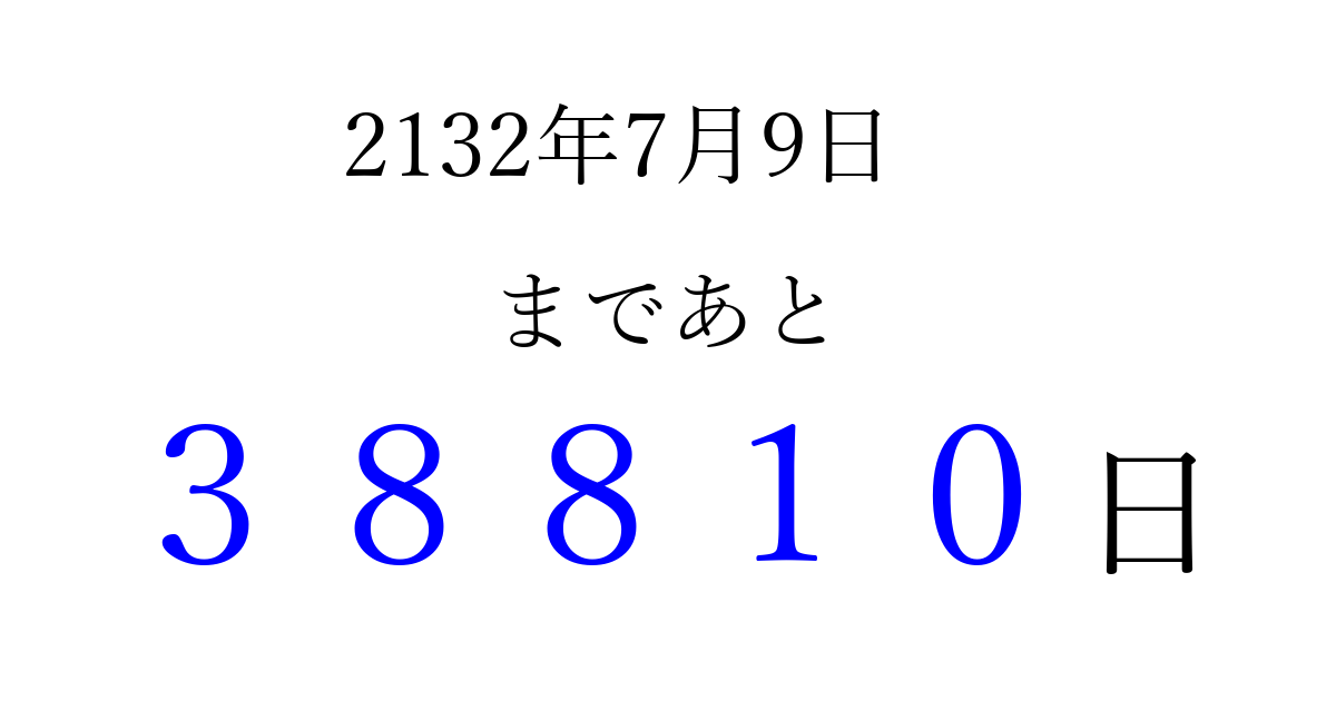 2132年7月9日(水)まで あと 99999 日です 追加すると、トップページからすぐ選べるようになります ※2026/04/06現在の結果です。 最新の状態に更新する ↓シェアして、タイムライン上にカウントダウンを表示しよう!↓ 📤 この結果を共有する Tweet シェア Threads Bluesky 別の日付でカウントダウン 2132年7月のカレンダー このページをブックマークに追加すると、いつでもカウントダウンを確認できます。 (PC: Ctrl+D / Mac: ⌘+D) hitome-notes.comでは以下のページも運営しています。 指定日と期間から日付を計算 | ガチャ確率計算・シミュレーション | プライバシー・ポリシー 運営者:Avocado
