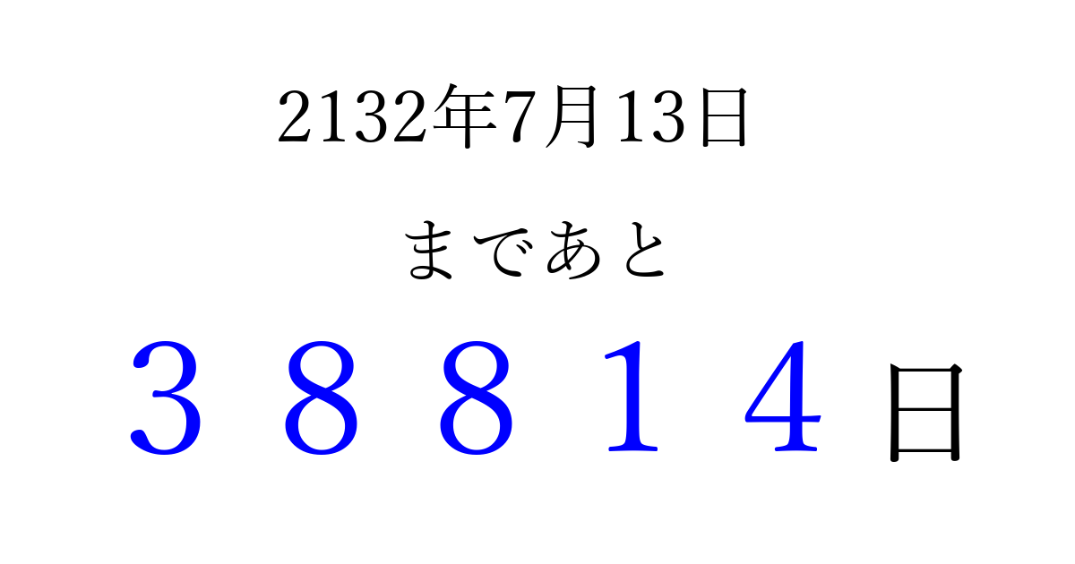 2132年7月13日(日)まで あと 99999 日です 追加すると、トップページからすぐ選べるようになります ※2026/04/06現在の結果です。 最新の状態に更新する ↓シェアして、タイムライン上にカウントダウンを表示しよう!↓ 📤 この結果を共有する Tweet シェア Threads Bluesky 別の日付でカウントダウン 2132年7月のカレンダー このページをブックマークに追加すると、いつでもカウントダウンを確認できます。 (PC: Ctrl+D / Mac: ⌘+D) hitome-notes.comでは以下のページも運営しています。 指定日と期間から日付を計算 | ガチャ確率計算・シミュレーション | プライバシー・ポリシー 運営者:Avocado