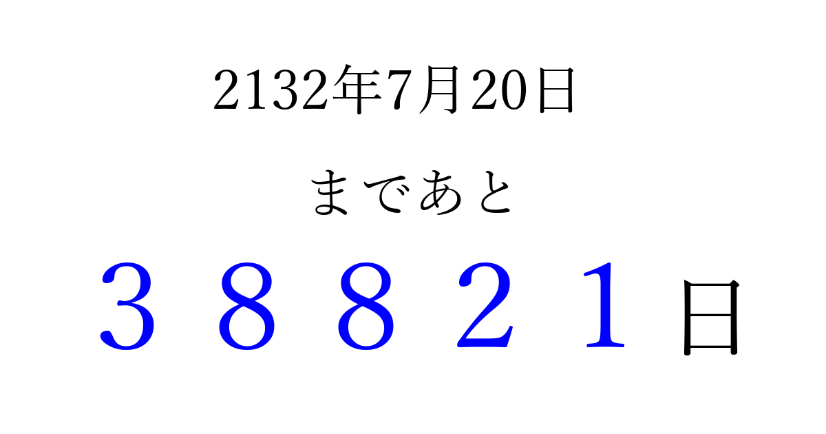 2132年7月20日(日)まで あと 99999 日です 追加すると、トップページからすぐ選べるようになります ※2026/04/06現在の結果です。 最新の状態に更新する ↓シェアして、タイムライン上にカウントダウンを表示しよう!↓ 📤 この結果を共有する Tweet シェア Threads Bluesky 別の日付でカウントダウン 2132年7月のカレンダー このページをブックマークに追加すると、いつでもカウントダウンを確認できます。 (PC: Ctrl+D / Mac: ⌘+D) hitome-notes.comでは以下のページも運営しています。 指定日と期間から日付を計算 | ガチャ確率計算・シミュレーション | プライバシー・ポリシー 運営者:Avocado