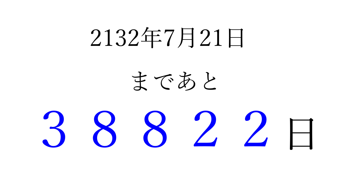 2132年7月21日(月)まで あと 99999 日です 追加すると、トップページからすぐ選べるようになります ※2026/04/06現在の結果です。 最新の状態に更新する ↓シェアして、タイムライン上にカウントダウンを表示しよう!↓ 📤 この結果を共有する Tweet シェア Threads Bluesky 別の日付でカウントダウン 2132年7月のカレンダー このページをブックマークに追加すると、いつでもカウントダウンを確認できます。 (PC: Ctrl+D / Mac: ⌘+D) hitome-notes.comでは以下のページも運営しています。 指定日と期間から日付を計算 | ガチャ確率計算・シミュレーション | プライバシー・ポリシー 運営者:Avocado