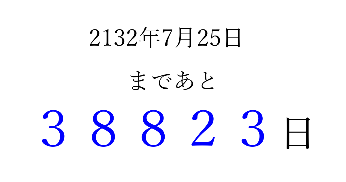 2132年7月25日(金)まで あと 99999 日です 追加すると、トップページからすぐ選べるようになります ※2026/04/09現在の結果です。 最新の状態に更新する ↓シェアして、タイムライン上にカウントダウンを表示しよう!↓ 📤 この結果を共有する Tweet シェア Threads Bluesky 別の日付でカウントダウン 2132年7月のカレンダー このページをブックマークに追加すると、いつでもカウントダウンを確認できます。 (PC: Ctrl+D / Mac: ⌘+D) hitome-notes.comでは以下のページも運営しています。 指定日と期間から日付を計算 | ガチャ確率計算・シミュレーション | プライバシー・ポリシー 運営者:Avocado