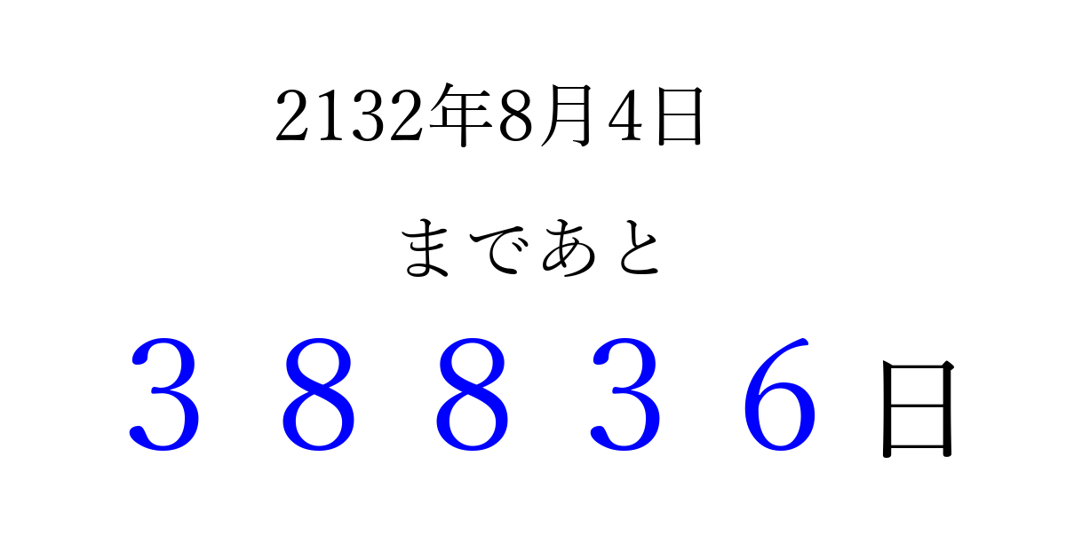 2132年8月4日(月)まで あと 99999 日です 追加すると、トップページからすぐ選べるようになります ※2026/04/06現在の結果です。 最新の状態に更新する ↓シェアして、タイムライン上にカウントダウンを表示しよう!↓ 📤 この結果を共有する Tweet シェア Threads Bluesky 別の日付でカウントダウン 2132年8月のカレンダー このページをブックマークに追加すると、いつでもカウントダウンを確認できます。 (PC: Ctrl+D / Mac: ⌘+D) hitome-notes.comでは以下のページも運営しています。 指定日と期間から日付を計算 | ガチャ確率計算・シミュレーション | プライバシー・ポリシー 運営者:Avocado