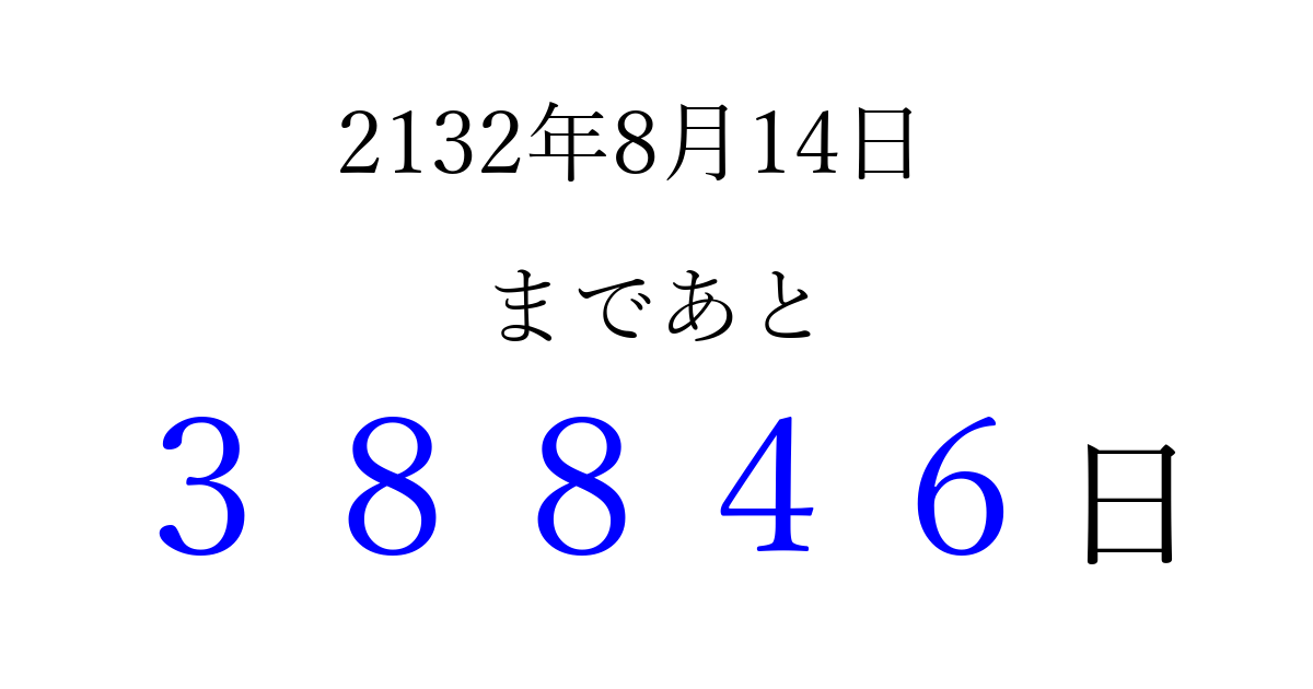 2132年8月14日(木)まで あと 99999 日です 追加すると、トップページからすぐ選べるようになります ※2026/04/06現在の結果です。 最新の状態に更新する ↓シェアして、タイムライン上にカウントダウンを表示しよう!↓ 📤 この結果を共有する Tweet シェア Threads Bluesky 別の日付でカウントダウン 2132年8月のカレンダー このページをブックマークに追加すると、いつでもカウントダウンを確認できます。 (PC: Ctrl+D / Mac: ⌘+D) hitome-notes.comでは以下のページも運営しています。 指定日と期間から日付を計算 | ガチャ確率計算・シミュレーション | プライバシー・ポリシー 運営者:Avocado