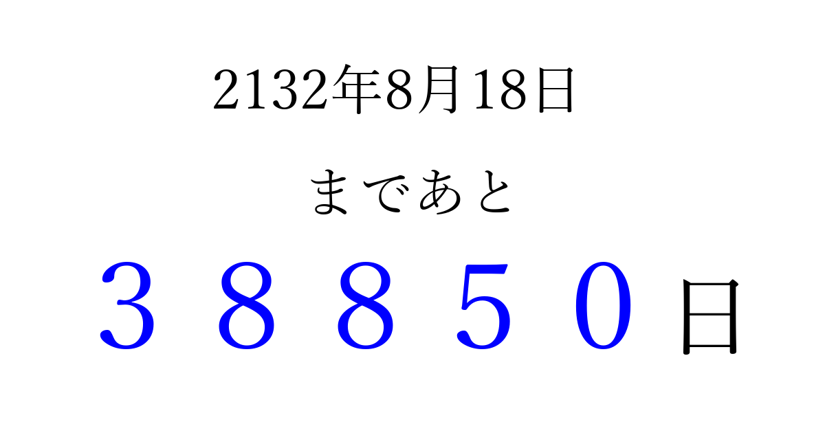 2132年8月18日(月)まで あと 99999 日です 追加すると、トップページからすぐ選べるようになります ※2026/04/06現在の結果です。 最新の状態に更新する ↓シェアして、タイムライン上にカウントダウンを表示しよう!↓ 📤 この結果を共有する Tweet シェア Threads Bluesky 別の日付でカウントダウン 2132年8月のカレンダー このページをブックマークに追加すると、いつでもカウントダウンを確認できます。 (PC: Ctrl+D / Mac: ⌘+D) hitome-notes.comでは以下のページも運営しています。 指定日と期間から日付を計算 | ガチャ確率計算・シミュレーション | プライバシー・ポリシー 運営者:Avocado