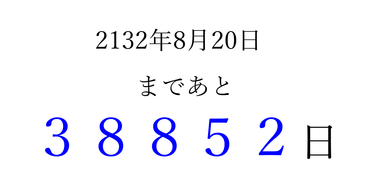 2132年8月20日(水)まで あと 99999 日です 追加すると、トップページからすぐ選べるようになります ※2026/04/06現在の結果です。 最新の状態に更新する ↓シェアして、タイムライン上にカウントダウンを表示しよう!↓ 📤 この結果を共有する Tweet シェア Threads Bluesky 別の日付でカウントダウン 2132年8月のカレンダー このページをブックマークに追加すると、いつでもカウントダウンを確認できます。 (PC: Ctrl+D / Mac: ⌘+D) hitome-notes.comでは以下のページも運営しています。 指定日と期間から日付を計算 | ガチャ確率計算・シミュレーション | プライバシー・ポリシー 運営者:Avocado