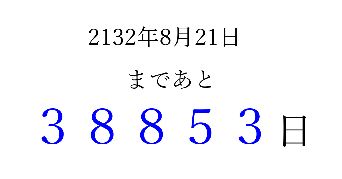 2132年8月21日(木)まで あと 99999 日です 追加すると、トップページからすぐ選べるようになります ※2026/04/06現在の結果です。 最新の状態に更新する ↓シェアして、タイムライン上にカウントダウンを表示しよう!↓ 📤 この結果を共有する Tweet シェア Threads Bluesky 別の日付でカウントダウン 2132年8月のカレンダー このページをブックマークに追加すると、いつでもカウントダウンを確認できます。 (PC: Ctrl+D / Mac: ⌘+D) hitome-notes.comでは以下のページも運営しています。 指定日と期間から日付を計算 | ガチャ確率計算・シミュレーション | プライバシー・ポリシー 運営者:Avocado