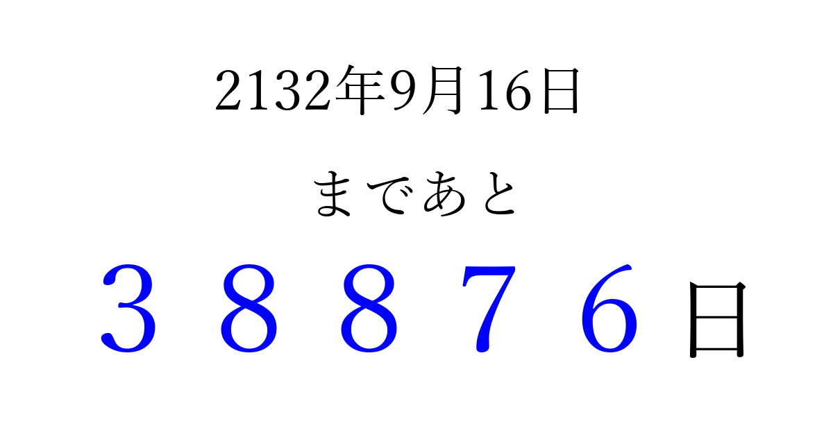 2132年9月16日(火)まで あと 99999 日です 追加すると、トップページからすぐ選べるようになります ※2026/04/09現在の結果です。 最新の状態に更新する ↓シェアして、タイムライン上にカウントダウンを表示しよう!↓ 📤 この結果を共有する Tweet シェア Threads Bluesky 別の日付でカウントダウン 2132年9月のカレンダー このページをブックマークに追加すると、いつでもカウントダウンを確認できます。 (PC: Ctrl+D / Mac: ⌘+D) hitome-notes.comでは以下のページも運営しています。 指定日と期間から日付を計算 | ガチャ確率計算・シミュレーション | プライバシー・ポリシー 運営者:Avocado