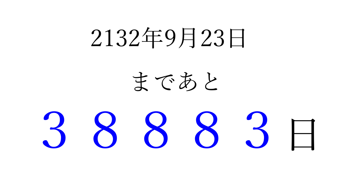 2132年9月23日(火)まで あと 99999 日です 追加すると、トップページからすぐ選べるようになります ※2026/04/09現在の結果です。 最新の状態に更新する ↓シェアして、タイムライン上にカウントダウンを表示しよう!↓ 📤 この結果を共有する Tweet シェア Threads Bluesky 別の日付でカウントダウン 2132年9月のカレンダー このページをブックマークに追加すると、いつでもカウントダウンを確認できます。 (PC: Ctrl+D / Mac: ⌘+D) hitome-notes.comでは以下のページも運営しています。 指定日と期間から日付を計算 | ガチャ確率計算・シミュレーション | プライバシー・ポリシー 運営者:Avocado