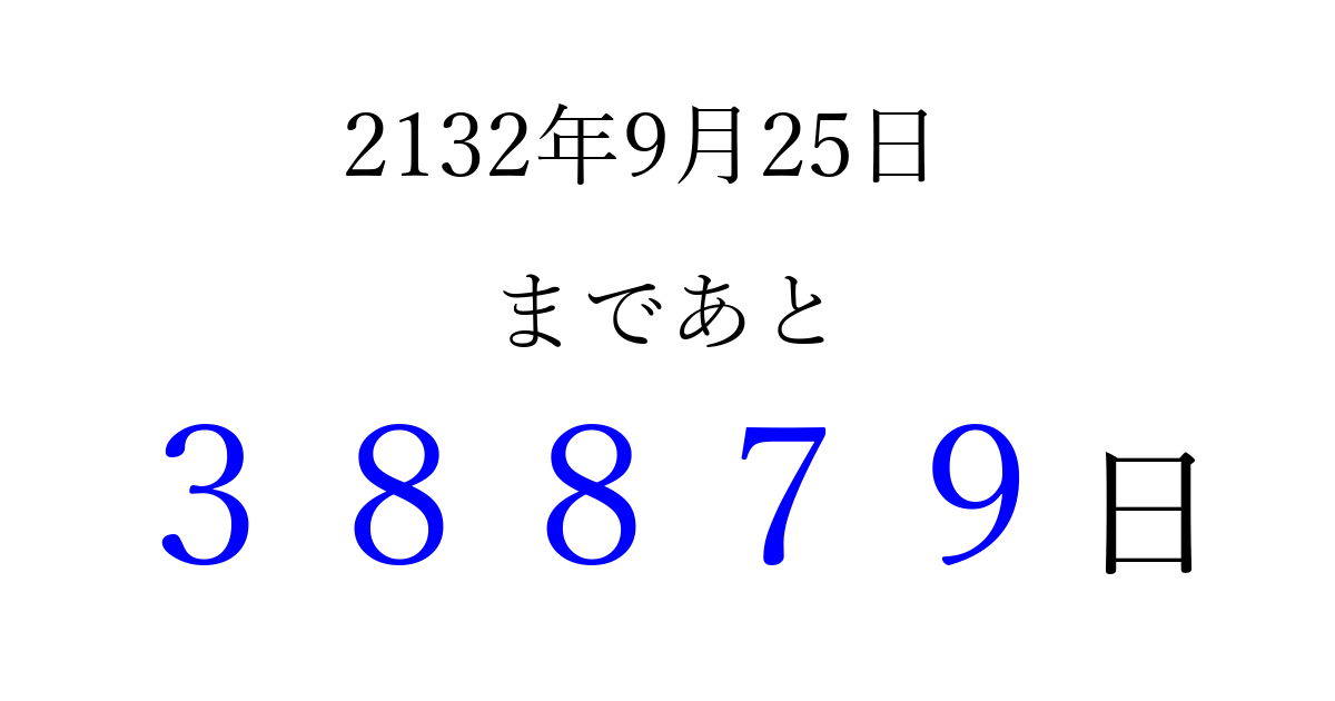 2132年9月25日(木)まで あと 99999 日です 追加すると、トップページからすぐ選べるようになります ※2026/04/15現在の結果です。 最新の状態に更新する ↓シェアして、タイムライン上にカウントダウンを表示しよう!↓ 📤 この結果を共有する Tweet シェア Threads Bluesky 別の日付でカウントダウン 2132年9月のカレンダー このページをブックマークに追加すると、いつでもカウントダウンを確認できます。 (PC: Ctrl+D / Mac: ⌘+D) hitome-notes.comでは以下のページも運営しています。 指定日と期間から日付を計算 | ガチャ確率計算・シミュレーション | プライバシー・ポリシー 運営者:Avocado