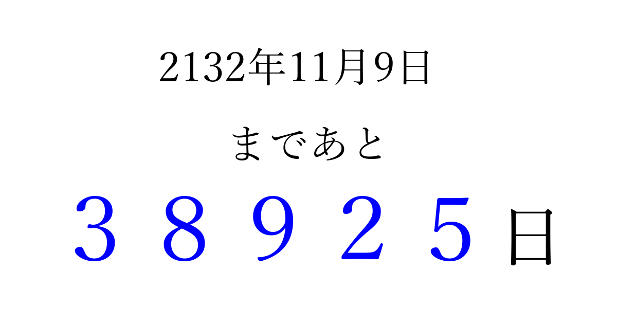 2132年11月9日(日)まで あと 99999 日です 追加すると、トップページからすぐ選べるようになります ※2026/04/14現在の結果です。 最新の状態に更新する ↓シェアして、タイムライン上にカウントダウンを表示しよう!↓ 📤 この結果を共有する Tweet シェア Threads Bluesky 別の日付でカウントダウン 2132年11月のカレンダー このページをブックマークに追加すると、いつでもカウントダウンを確認できます。 (PC: Ctrl+D / Mac: ⌘+D) hitome-notes.comでは以下のページも運営しています。 指定日と期間から日付を計算 | ガチャ確率計算・シミュレーション | プライバシー・ポリシー 運営者:Avocado
