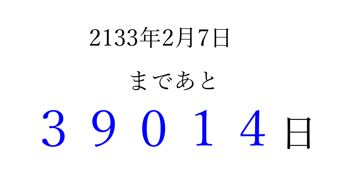 2133年2月7日(土)まで あと 99999 日です 追加すると、トップページからすぐ選べるようになります ※2026/04/15現在の結果です。 最新の状態に更新する ↓シェアして、タイムライン上にカウントダウンを表示しよう!↓ 📤 この結果を共有する Tweet シェア Threads Bluesky 別の日付でカウントダウン 2133年2月のカレンダー このページをブックマークに追加すると、いつでもカウントダウンを確認できます。 (PC: Ctrl+D / Mac: ⌘+D) hitome-notes.comでは以下のページも運営しています。 指定日と期間から日付を計算 | ガチャ確率計算・シミュレーション | プライバシー・ポリシー 運営者:Avocado