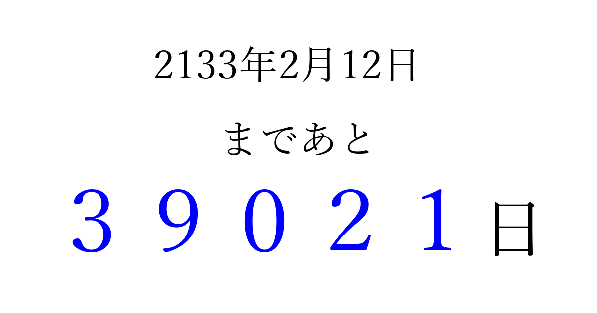 2133年2月12日(木)まで あと 99999 日です 追加すると、トップページからすぐ選べるようになります ※2026/04/13現在の結果です。 最新の状態に更新する ↓シェアして、タイムライン上にカウントダウンを表示しよう!↓ 📤 この結果を共有する Tweet シェア Threads Bluesky 別の日付でカウントダウン 2133年2月のカレンダー このページをブックマークに追加すると、いつでもカウントダウンを確認できます。 (PC: Ctrl+D / Mac: ⌘+D) hitome-notes.comでは以下のページも運営しています。 指定日と期間から日付を計算 | ガチャ確率計算・シミュレーション | プライバシー・ポリシー 運営者:Avocado