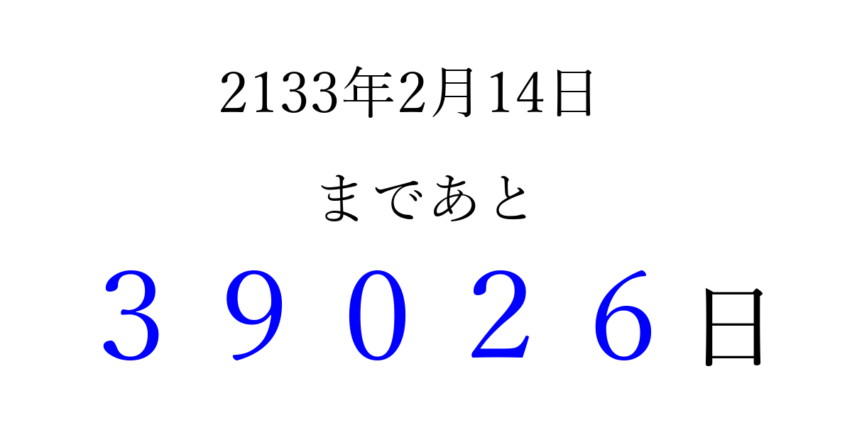 2133年2月14日(土)まで あと 99999 日です 追加すると、トップページからすぐ選べるようになります ※2026/04/10現在の結果です。 最新の状態に更新する ↓シェアして、タイムライン上にカウントダウンを表示しよう!↓ 📤 この結果を共有する Tweet シェア Threads Bluesky 別の日付でカウントダウン 2133年2月のカレンダー このページをブックマークに追加すると、いつでもカウントダウンを確認できます。 (PC: Ctrl+D / Mac: ⌘+D) hitome-notes.comでは以下のページも運営しています。 指定日と期間から日付を計算 | ガチャ確率計算・シミュレーション | プライバシー・ポリシー 運営者:Avocado