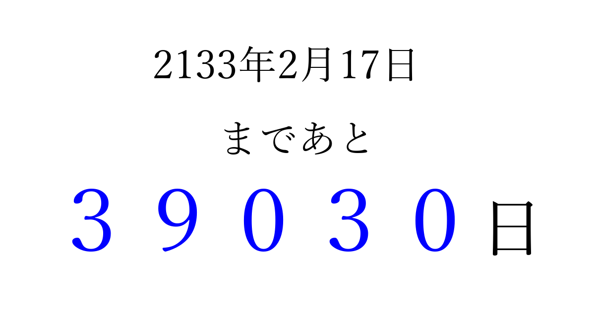 2133年2月17日(火)まで あと 99999 日です 追加すると、トップページからすぐ選べるようになります ※2026/04/09現在の結果です。 最新の状態に更新する ↓シェアして、タイムライン上にカウントダウンを表示しよう!↓ 📤 この結果を共有する Tweet シェア Threads Bluesky 別の日付でカウントダウン 2133年2月のカレンダー このページをブックマークに追加すると、いつでもカウントダウンを確認できます。 (PC: Ctrl+D / Mac: ⌘+D) hitome-notes.comでは以下のページも運営しています。 指定日と期間から日付を計算 | ガチャ確率計算・シミュレーション | プライバシー・ポリシー 運営者:Avocado