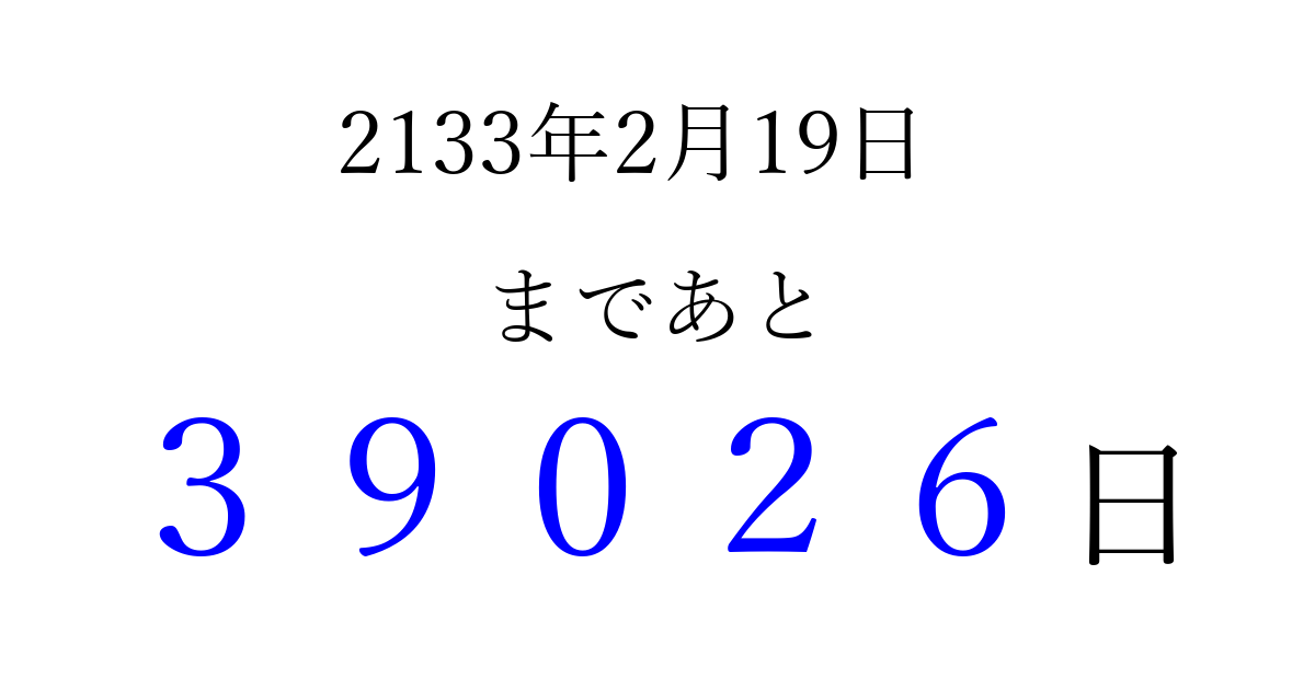 2133年2月19日(木)まで あと 99999 日です 追加すると、トップページからすぐ選べるようになります ※2026/04/15現在の結果です。 最新の状態に更新する ↓シェアして、タイムライン上にカウントダウンを表示しよう!↓ 📤 この結果を共有する Tweet シェア Threads Bluesky 別の日付でカウントダウン 2133年2月のカレンダー このページをブックマークに追加すると、いつでもカウントダウンを確認できます。 (PC: Ctrl+D / Mac: ⌘+D) hitome-notes.comでは以下のページも運営しています。 指定日と期間から日付を計算 | ガチャ確率計算・シミュレーション | プライバシー・ポリシー 運営者:Avocado