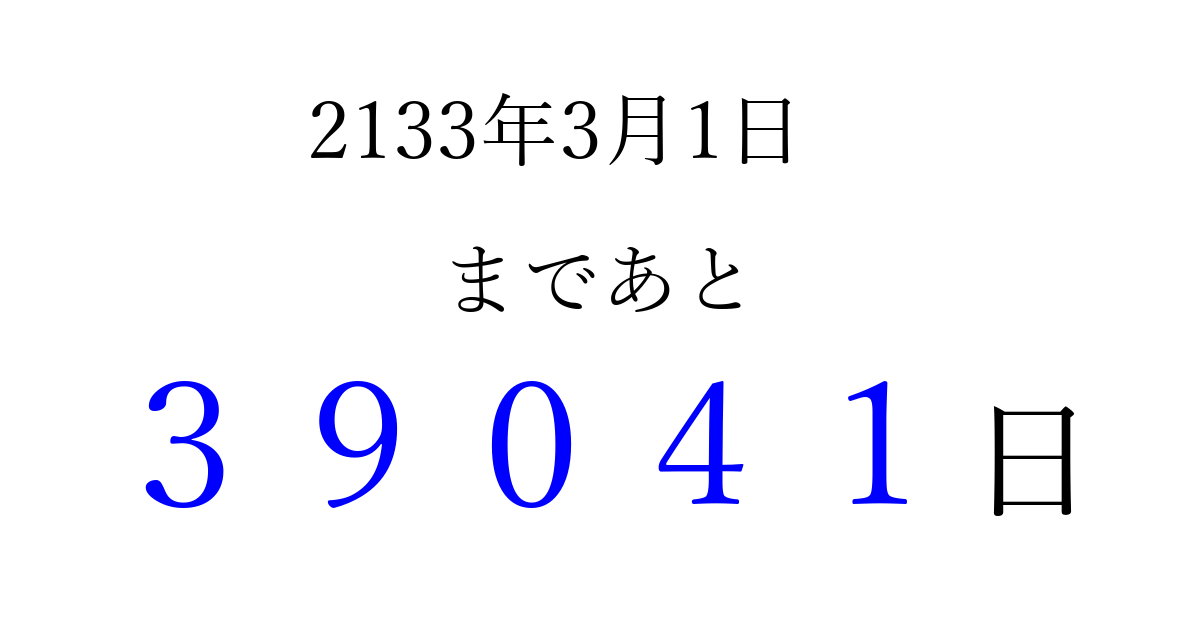 2133年3月1日(日)まで あと 99999 日です 追加すると、トップページからすぐ選べるようになります ※2026/04/10現在の結果です。 最新の状態に更新する ↓シェアして、タイムライン上にカウントダウンを表示しよう!↓ 📤 この結果を共有する Tweet シェア Threads Bluesky 別の日付でカウントダウン 2133年3月のカレンダー このページをブックマークに追加すると、いつでもカウントダウンを確認できます。 (PC: Ctrl+D / Mac: ⌘+D) hitome-notes.comでは以下のページも運営しています。 指定日と期間から日付を計算 | ガチャ確率計算・シミュレーション | プライバシー・ポリシー 運営者:Avocado