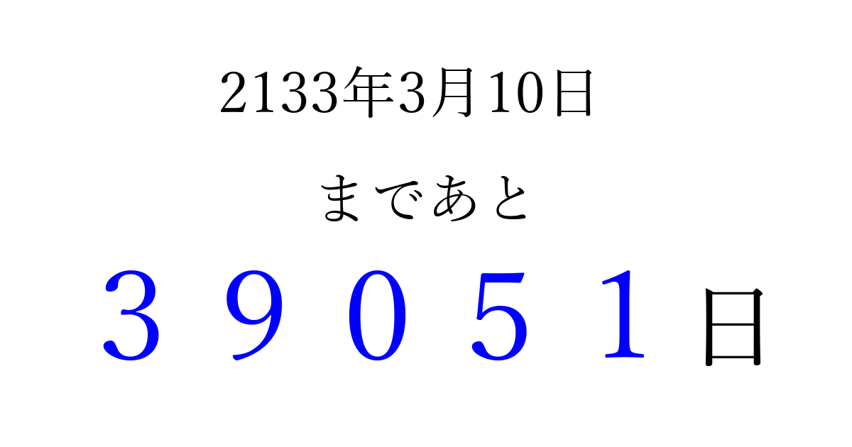 2133年3月10日(火)まで あと 99999 日です 追加すると、トップページからすぐ選べるようになります ※2026/04/09現在の結果です。 最新の状態に更新する ↓シェアして、タイムライン上にカウントダウンを表示しよう!↓ 📤 この結果を共有する Tweet シェア Threads Bluesky 別の日付でカウントダウン 2133年3月のカレンダー このページをブックマークに追加すると、いつでもカウントダウンを確認できます。 (PC: Ctrl+D / Mac: ⌘+D) hitome-notes.comでは以下のページも運営しています。 指定日と期間から日付を計算 | ガチャ確率計算・シミュレーション | プライバシー・ポリシー 運営者:Avocado
