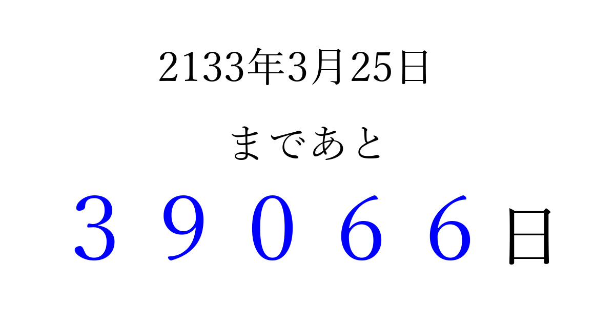 2133年3月25日(水)まで あと 99999 日です 追加すると、トップページからすぐ選べるようになります ※2026/04/09現在の結果です。 最新の状態に更新する ↓シェアして、タイムライン上にカウントダウンを表示しよう!↓ 📤 この結果を共有する Tweet シェア Threads Bluesky 別の日付でカウントダウン 2133年3月のカレンダー このページをブックマークに追加すると、いつでもカウントダウンを確認できます。 (PC: Ctrl+D / Mac: ⌘+D) hitome-notes.comでは以下のページも運営しています。 指定日と期間から日付を計算 | ガチャ確率計算・シミュレーション | プライバシー・ポリシー 運営者:Avocado