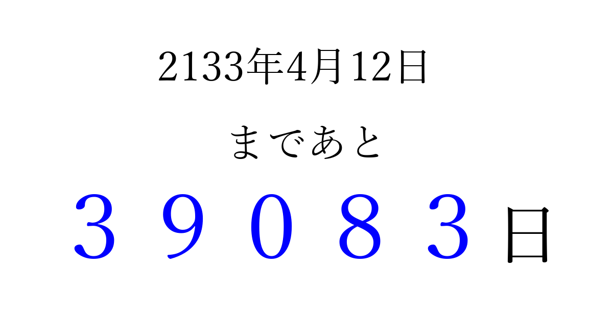 2133年4月12日(日)まで あと 99999 日です 追加すると、トップページからすぐ選べるようになります ※2026/04/10現在の結果です。 最新の状態に更新する ↓シェアして、タイムライン上にカウントダウンを表示しよう!↓ 📤 この結果を共有する Tweet シェア Threads Bluesky 別の日付でカウントダウン 2133年4月のカレンダー このページをブックマークに追加すると、いつでもカウントダウンを確認できます。 (PC: Ctrl+D / Mac: ⌘+D) hitome-notes.comでは以下のページも運営しています。 指定日と期間から日付を計算 | ガチャ確率計算・シミュレーション | プライバシー・ポリシー 運営者:Avocado