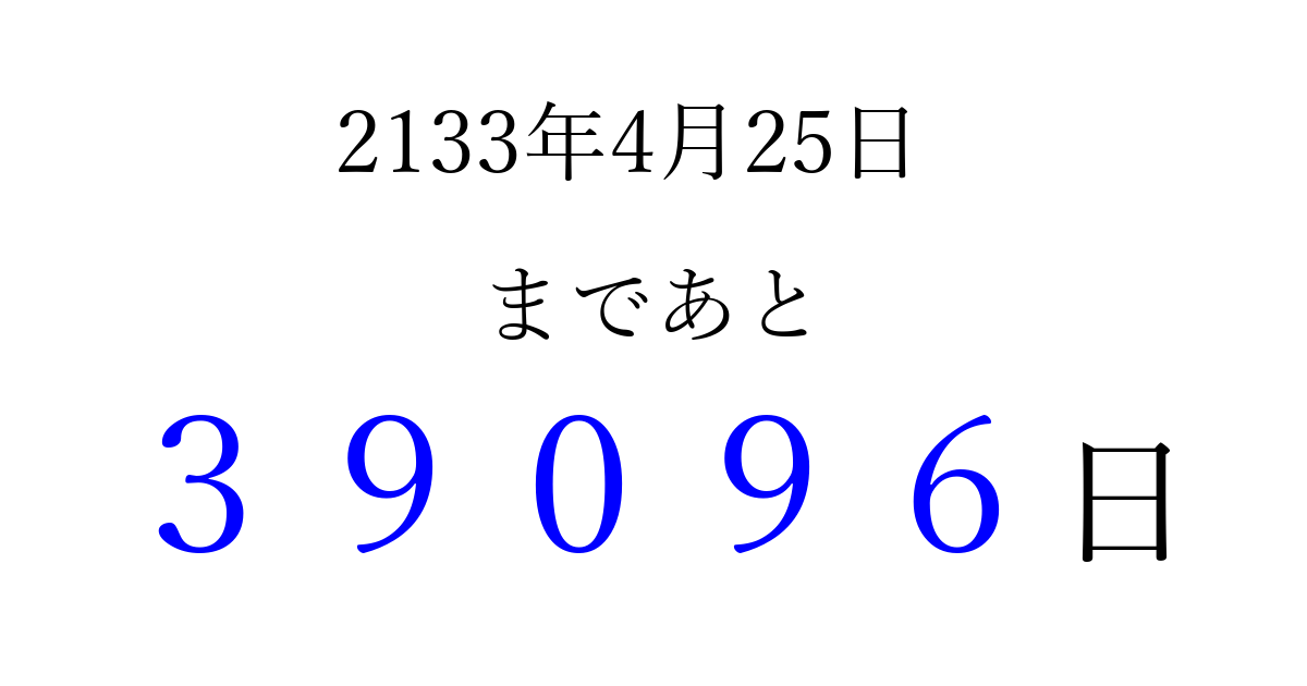 2133年4月25日(土)まで あと 99999 日です 追加すると、トップページからすぐ選べるようになります ※2026/04/10現在の結果です。 最新の状態に更新する ↓シェアして、タイムライン上にカウントダウンを表示しよう!↓ 📤 この結果を共有する Tweet シェア Threads Bluesky 別の日付でカウントダウン 2133年4月のカレンダー このページをブックマークに追加すると、いつでもカウントダウンを確認できます。 (PC: Ctrl+D / Mac: ⌘+D) hitome-notes.comでは以下のページも運営しています。 指定日と期間から日付を計算 | ガチャ確率計算・シミュレーション | プライバシー・ポリシー 運営者:Avocado