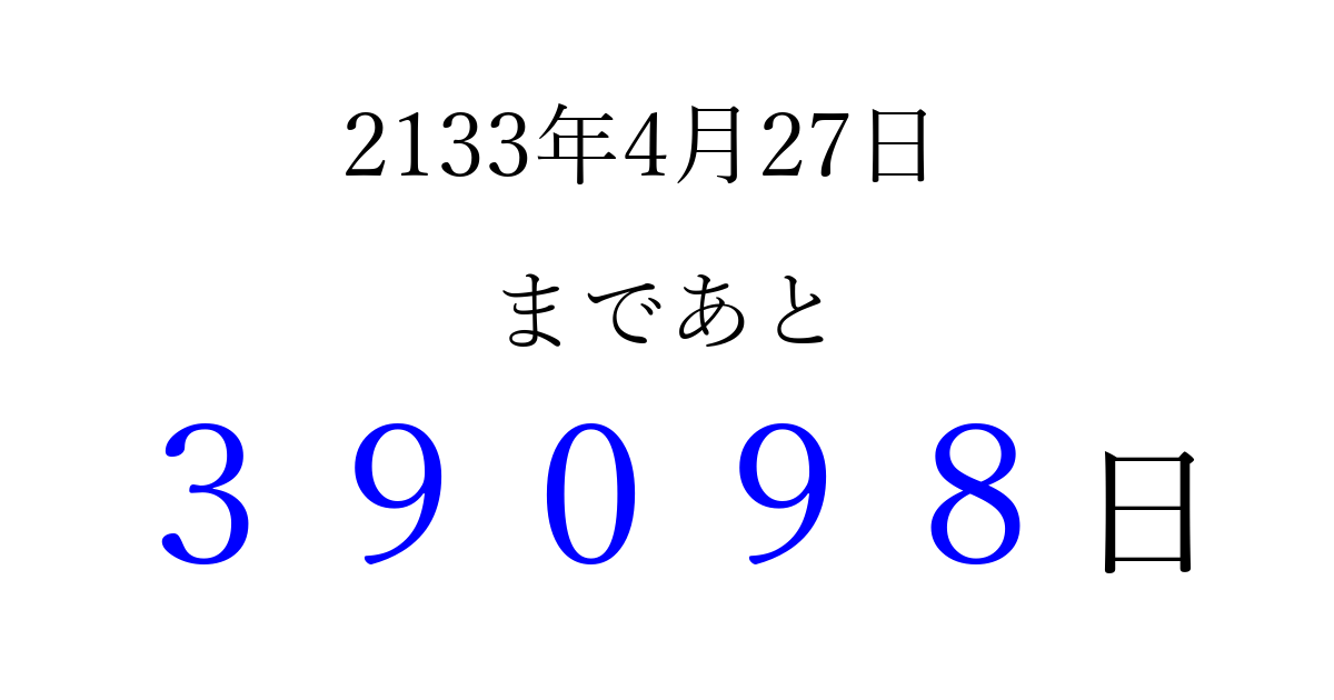 2133年4月27日(月)まで あと 99999 日です 追加すると、トップページからすぐ選べるようになります ※2026/04/10現在の結果です。 最新の状態に更新する ↓シェアして、タイムライン上にカウントダウンを表示しよう!↓ 📤 この結果を共有する Tweet シェア Threads Bluesky 別の日付でカウントダウン 2133年4月のカレンダー このページをブックマークに追加すると、いつでもカウントダウンを確認できます。 (PC: Ctrl+D / Mac: ⌘+D) hitome-notes.comでは以下のページも運営しています。 指定日と期間から日付を計算 | ガチャ確率計算・シミュレーション | プライバシー・ポリシー 運営者:Avocado