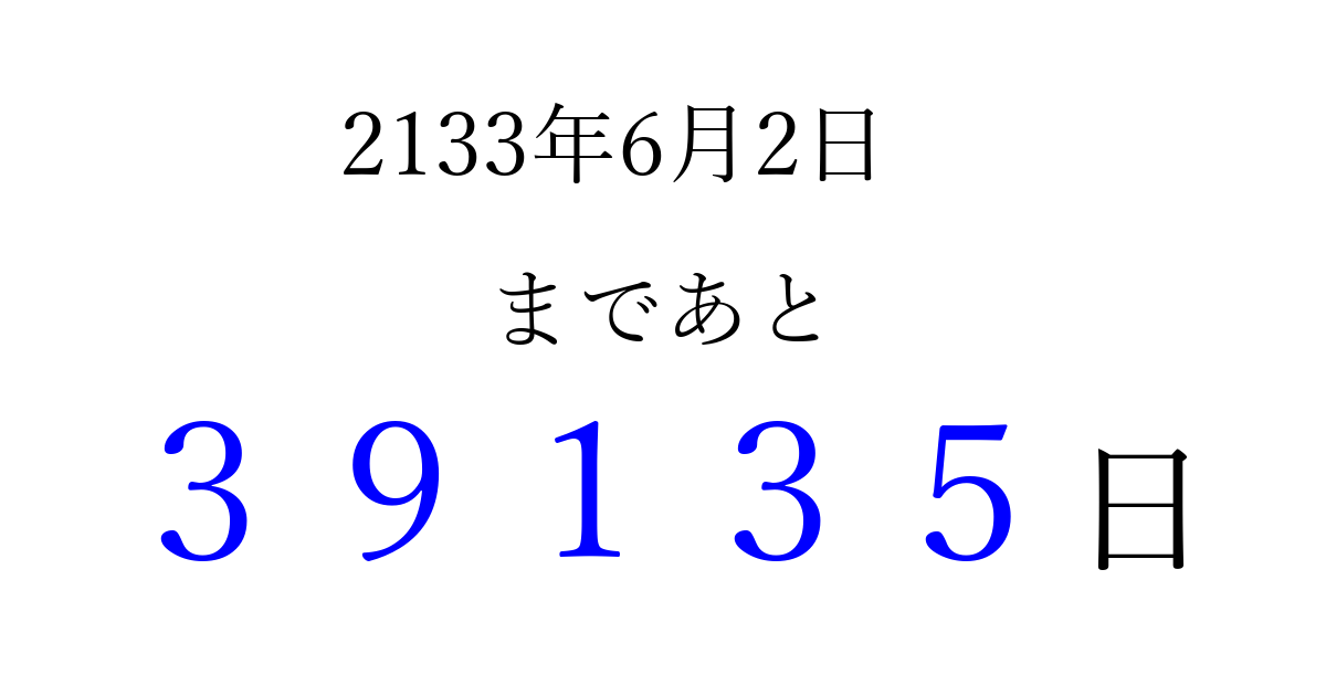 2133年6月2日(火)まで あと 99999 日です 追加すると、トップページからすぐ選べるようになります ※2026/04/09現在の結果です。 最新の状態に更新する ↓シェアして、タイムライン上にカウントダウンを表示しよう!↓ 📤 この結果を共有する Tweet シェア Threads Bluesky 別の日付でカウントダウン 2133年6月のカレンダー このページをブックマークに追加すると、いつでもカウントダウンを確認できます。 (PC: Ctrl+D / Mac: ⌘+D) hitome-notes.comでは以下のページも運営しています。 指定日と期間から日付を計算 | ガチャ確率計算・シミュレーション | プライバシー・ポリシー 運営者:Avocado