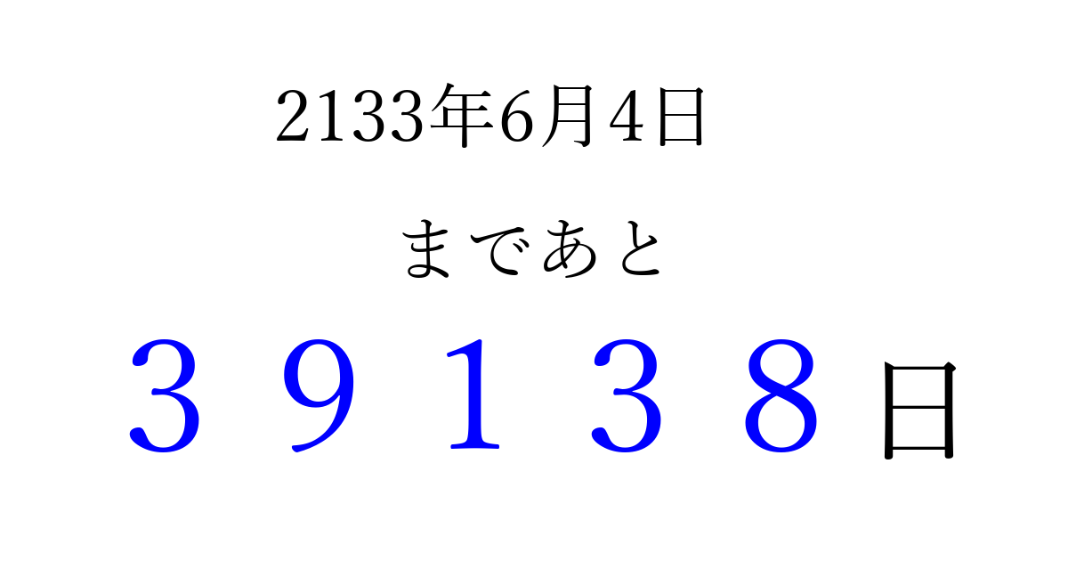 2133年6月4日(木)まで あと 99999 日です 追加すると、トップページからすぐ選べるようになります ※2026/04/08現在の結果です。 最新の状態に更新する ↓シェアして、タイムライン上にカウントダウンを表示しよう!↓ 📤 この結果を共有する Tweet シェア Threads Bluesky 別の日付でカウントダウン 2133年6月のカレンダー このページをブックマークに追加すると、いつでもカウントダウンを確認できます。 (PC: Ctrl+D / Mac: ⌘+D) hitome-notes.comでは以下のページも運営しています。 指定日と期間から日付を計算 | ガチャ確率計算・シミュレーション | プライバシー・ポリシー 運営者:Avocado