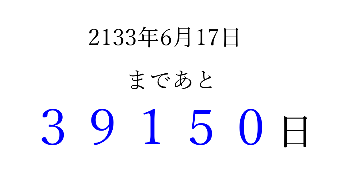 2133年6月17日(水)まで あと 99999 日です 追加すると、トップページからすぐ選べるようになります ※2026/04/09現在の結果です。 最新の状態に更新する ↓シェアして、タイムライン上にカウントダウンを表示しよう!↓ 📤 この結果を共有する Tweet シェア Threads Bluesky 別の日付でカウントダウン 2133年6月のカレンダー このページをブックマークに追加すると、いつでもカウントダウンを確認できます。 (PC: Ctrl+D / Mac: ⌘+D) hitome-notes.comでは以下のページも運営しています。 指定日と期間から日付を計算 | ガチャ確率計算・シミュレーション | プライバシー・ポリシー 運営者:Avocado