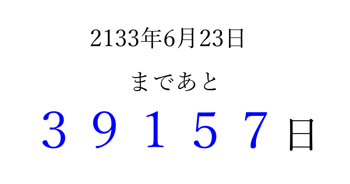 2133年6月23日(火)まで あと 99999 日です 追加すると、トップページからすぐ選べるようになります ※2026/04/08現在の結果です。 最新の状態に更新する ↓シェアして、タイムライン上にカウントダウンを表示しよう!↓ 📤 この結果を共有する Tweet シェア Threads Bluesky 別の日付でカウントダウン 2133年6月のカレンダー このページをブックマークに追加すると、いつでもカウントダウンを確認できます。 (PC: Ctrl+D / Mac: ⌘+D) hitome-notes.comでは以下のページも運営しています。 指定日と期間から日付を計算 | ガチャ確率計算・シミュレーション | プライバシー・ポリシー 運営者:Avocado