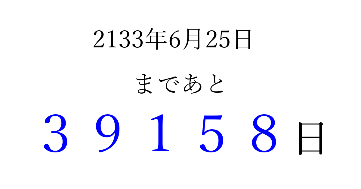 2133年6月25日(木)まで あと 99999 日です 追加すると、トップページからすぐ選べるようになります ※2026/04/09現在の結果です。 最新の状態に更新する ↓シェアして、タイムライン上にカウントダウンを表示しよう!↓ 📤 この結果を共有する Tweet シェア Threads Bluesky 別の日付でカウントダウン 2133年6月のカレンダー このページをブックマークに追加すると、いつでもカウントダウンを確認できます。 (PC: Ctrl+D / Mac: ⌘+D) hitome-notes.comでは以下のページも運営しています。 指定日と期間から日付を計算 | ガチャ確率計算・シミュレーション | プライバシー・ポリシー 運営者:Avocado