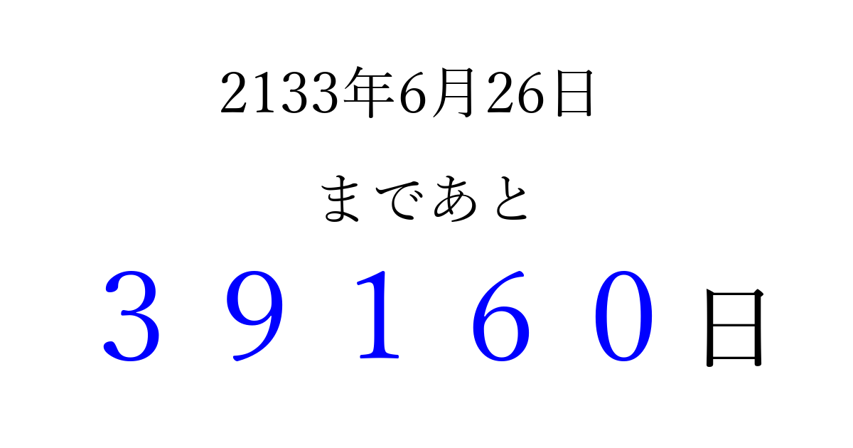 2133年6月26日(金)まで あと 99999 日です 追加すると、トップページからすぐ選べるようになります ※2026/04/08現在の結果です。 最新の状態に更新する ↓シェアして、タイムライン上にカウントダウンを表示しよう!↓ 📤 この結果を共有する Tweet シェア Threads Bluesky 別の日付でカウントダウン 2133年6月のカレンダー このページをブックマークに追加すると、いつでもカウントダウンを確認できます。 (PC: Ctrl+D / Mac: ⌘+D) hitome-notes.comでは以下のページも運営しています。 指定日と期間から日付を計算 | ガチャ確率計算・シミュレーション | プライバシー・ポリシー 運営者:Avocado