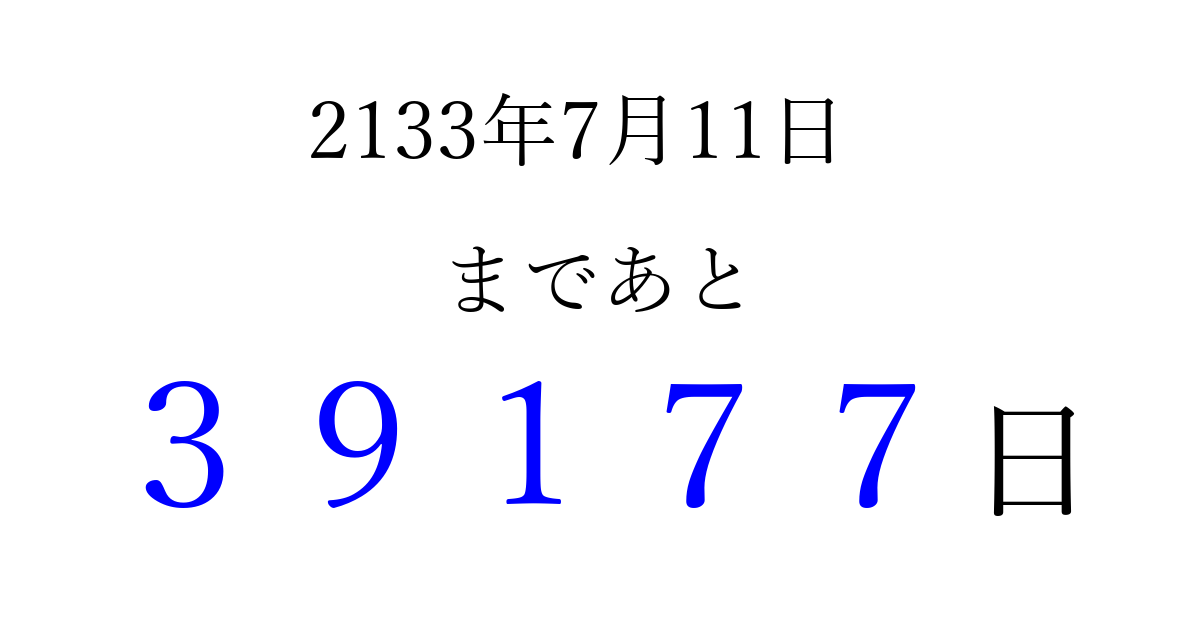 2133年7月11日(土)まで あと 99999 日です 追加すると、トップページからすぐ選べるようになります ※2026/04/06現在の結果です。 最新の状態に更新する ↓シェアして、タイムライン上にカウントダウンを表示しよう!↓ 📤 この結果を共有する Tweet シェア Threads Bluesky 別の日付でカウントダウン 2133年7月のカレンダー このページをブックマークに追加すると、いつでもカウントダウンを確認できます。 (PC: Ctrl+D / Mac: ⌘+D) hitome-notes.comでは以下のページも運営しています。 指定日と期間から日付を計算 | ガチャ確率計算・シミュレーション | プライバシー・ポリシー 運営者:Avocado