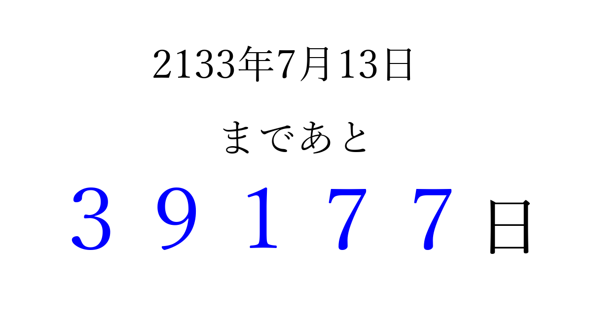 2133年7月13日(月)まで あと 99999 日です 追加すると、トップページからすぐ選べるようになります ※2026/04/08現在の結果です。 最新の状態に更新する ↓シェアして、タイムライン上にカウントダウンを表示しよう!↓ 📤 この結果を共有する Tweet シェア Threads Bluesky 別の日付でカウントダウン 2133年7月のカレンダー このページをブックマークに追加すると、いつでもカウントダウンを確認できます。 (PC: Ctrl+D / Mac: ⌘+D) hitome-notes.comでは以下のページも運営しています。 指定日と期間から日付を計算 | ガチャ確率計算・シミュレーション | プライバシー・ポリシー 運営者:Avocado