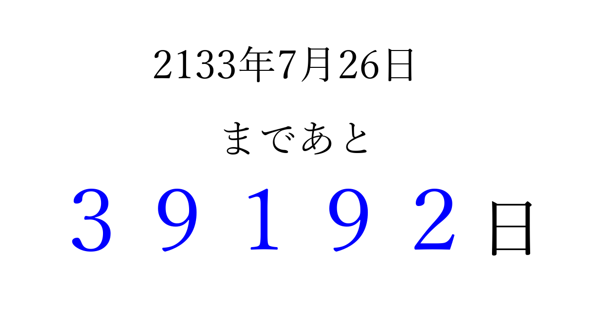 2133年7月26日(日)まで あと 99999 日です 追加すると、トップページからすぐ選べるようになります ※2026/04/06現在の結果です。 最新の状態に更新する ↓シェアして、タイムライン上にカウントダウンを表示しよう!↓ 📤 この結果を共有する Tweet シェア Threads Bluesky 別の日付でカウントダウン 2133年7月のカレンダー このページをブックマークに追加すると、いつでもカウントダウンを確認できます。 (PC: Ctrl+D / Mac: ⌘+D) hitome-notes.comでは以下のページも運営しています。 指定日と期間から日付を計算 | ガチャ確率計算・シミュレーション | プライバシー・ポリシー 運営者:Avocado