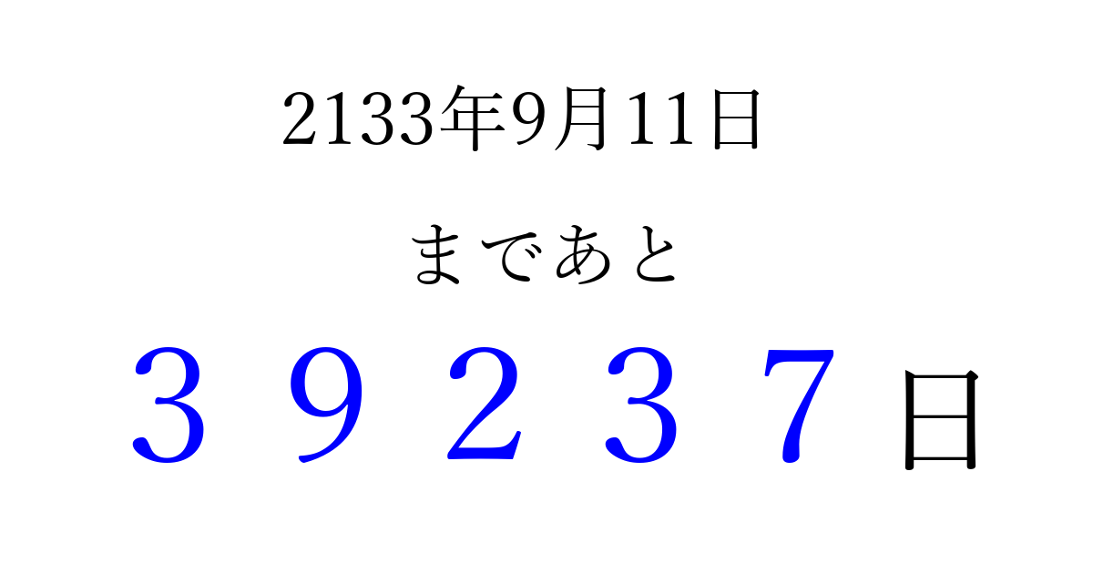 2133年9月11日(金)まで あと 99999 日です 追加すると、トップページからすぐ選べるようになります ※2026/04/08現在の結果です。 最新の状態に更新する ↓シェアして、タイムライン上にカウントダウンを表示しよう!↓ 📤 この結果を共有する Tweet シェア Threads Bluesky 別の日付でカウントダウン 2133年9月のカレンダー このページをブックマークに追加すると、いつでもカウントダウンを確認できます。 (PC: Ctrl+D / Mac: ⌘+D) hitome-notes.comでは以下のページも運営しています。 指定日と期間から日付を計算 | ガチャ確率計算・シミュレーション | プライバシー・ポリシー 運営者:Avocado